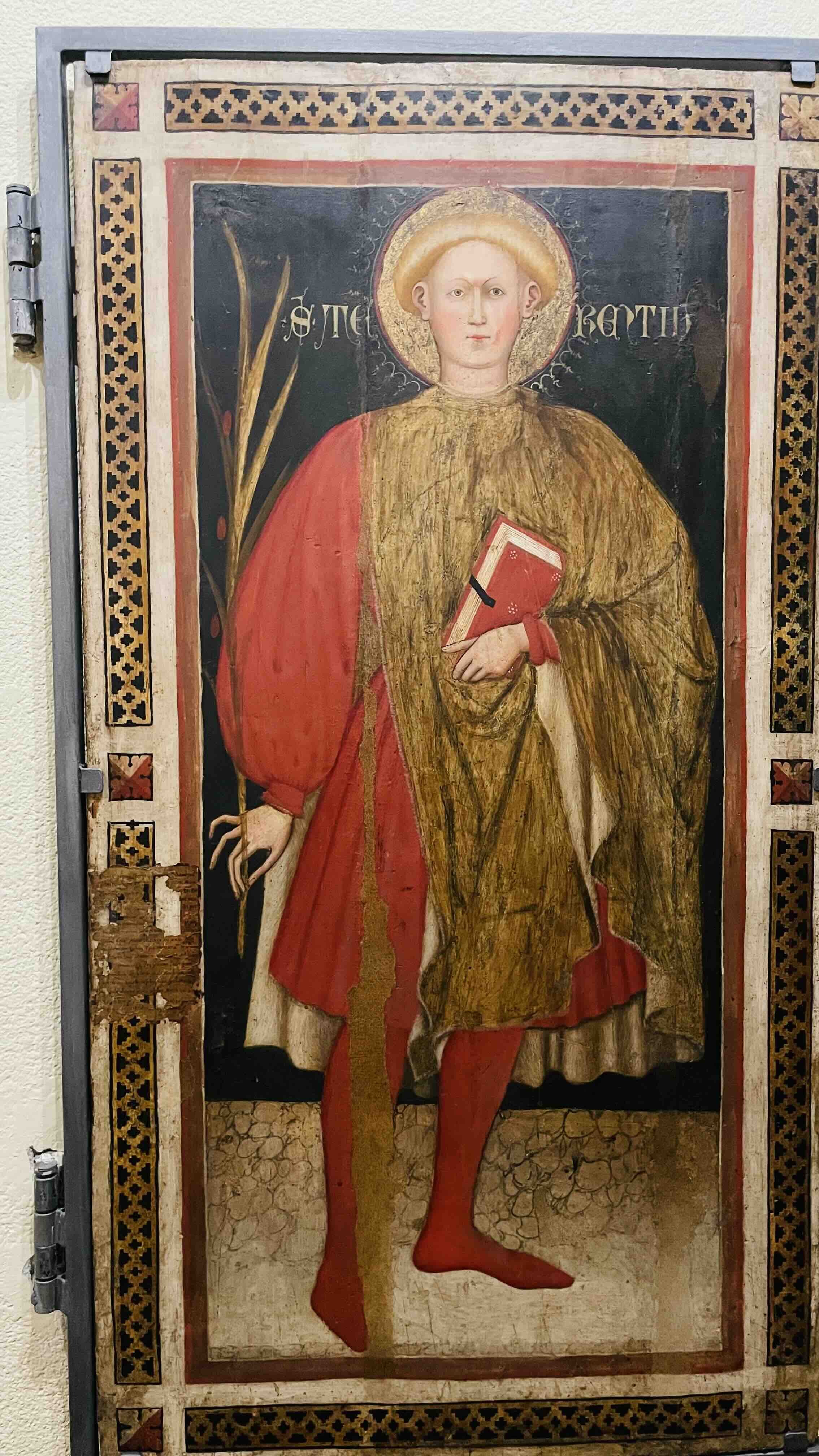 Next to the altarpiece is the Head of Saint John the Baptist from the Church of S. Giovanni Evangelista in Pesaro. Attributed to De Ruggieri Marco or Marco Zoppo. Recently, Roberto Longhi, changed their attribution in favour of Giovanni Bellini (12) but the opinions are different:
