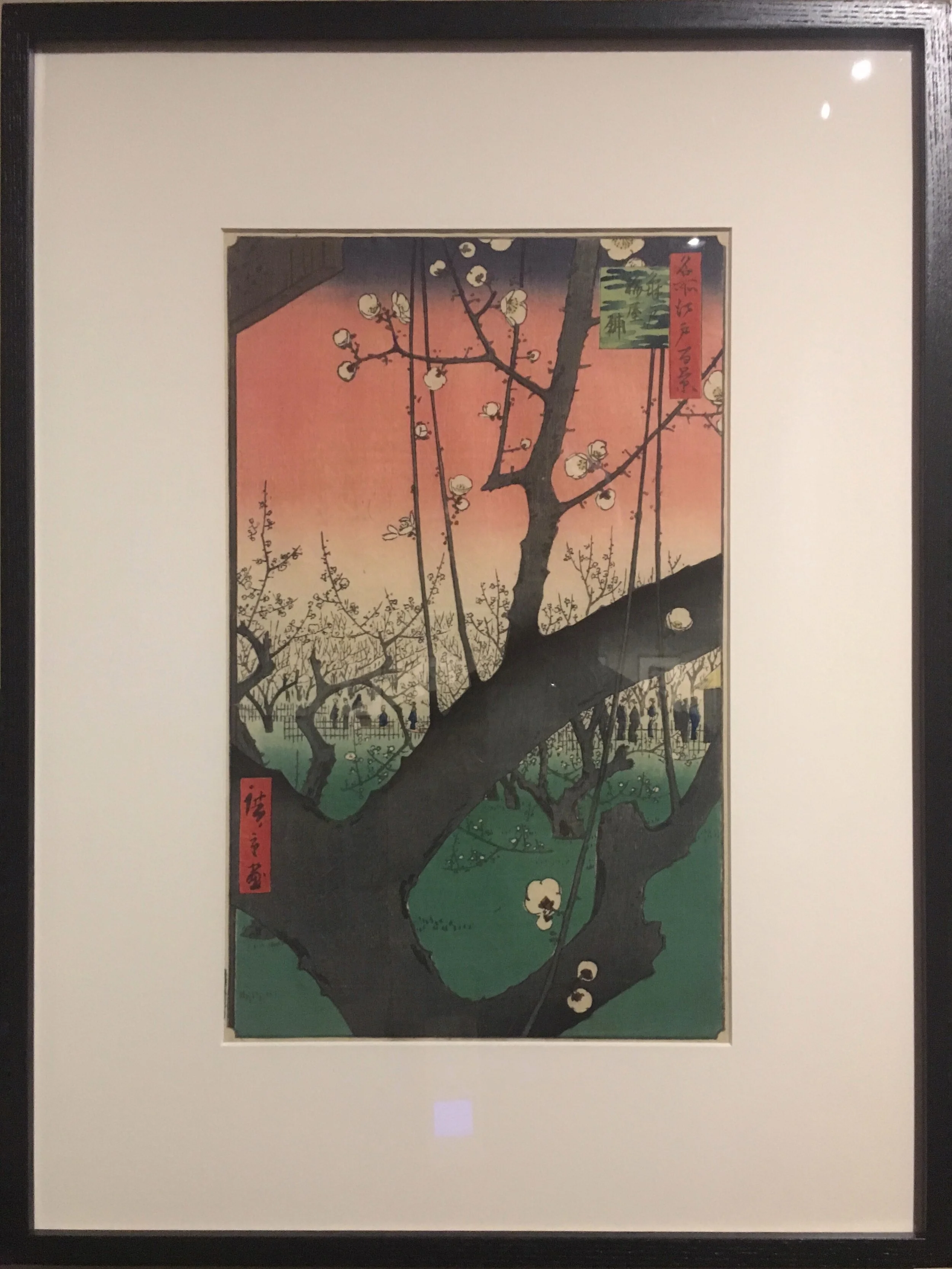 Hiroshige outlines the dream of that landscape. The representation is in perspective. In the first level, there is a majestic brown tree with white flowers. In the second there is a large clean green lawn. A midline divides the vision, in the path, dozens of people observe the wonderful blossoms. At the top, the sky is red and yellow. It is an explosion of nature.