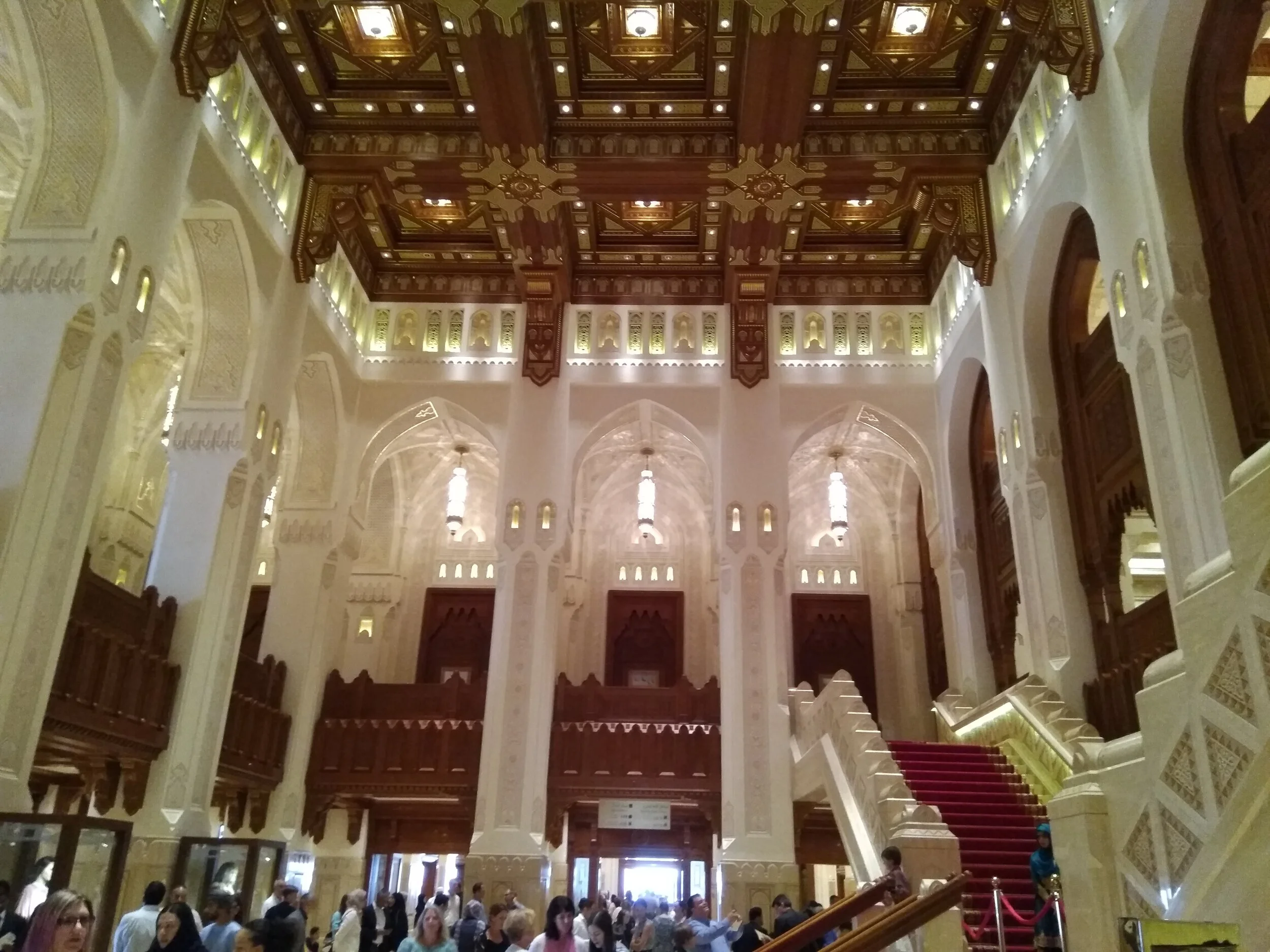 Passata la biglietteria nel grande foyer ci sono i costumi dei personaggi di opere già presentate. Il soffitto è di eleganti cassettoni rossi e color legno. Dal foyer partono le scale per l'interno del teatro accompagnate da tappetti rossi. I corridoi sono anch'essi dominati dal bianco, nel quale sono esposti dei quadri della tradizione omanita.