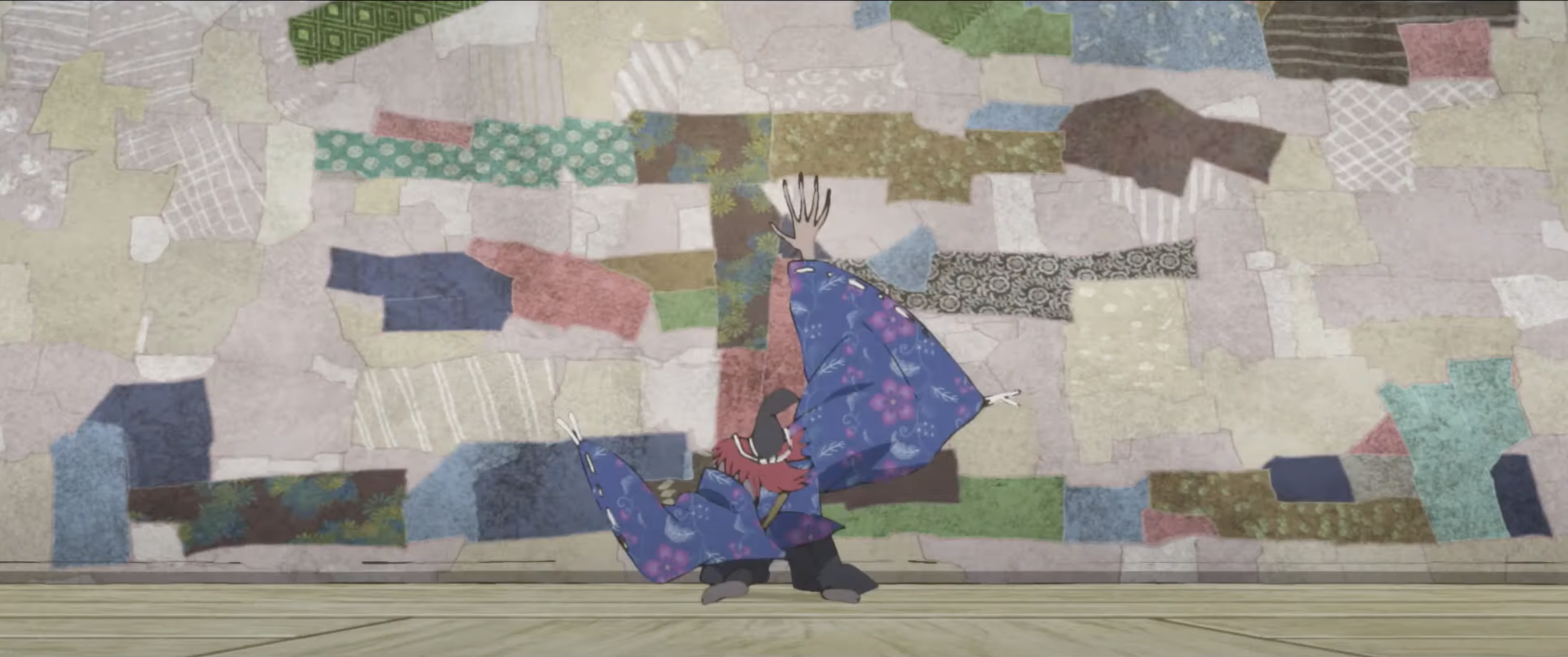 La motivazione è artistica. Le immagini riprendono velocemente un Giappone antico, ma sono discordanti dalla musica altisonante, moderna, ritmica, irresistibile. Alla quale si aggiunge una danza sensuale e rapida, accentuata dal braccio sproporzionato di Inu-oh. La diversità fra le scene e la musica è l'intelligente struttura.